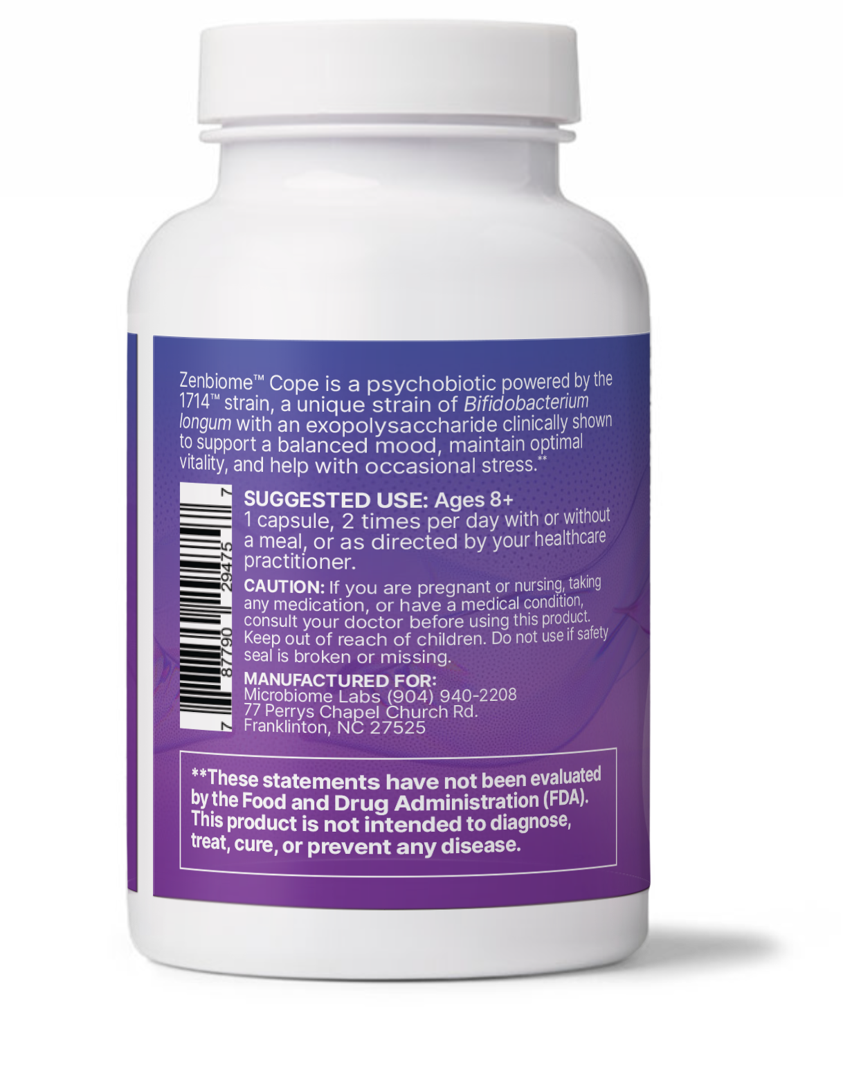 ZenBiome Cope inneholder den klinisk studerte psykobiotikaen Bifidobacterium longum 1714™, sammen med B-vitaminer og safran, for å støtte kroppen med å håndtere dagliglivets stress. Formelen kombinerer nøye utvalgte bakteriestammer og ingredienser som er designet for å hjelpe deg å tåle mer i hverdagen: mer press, mer tempo, mer stimuli - men med mer ro.